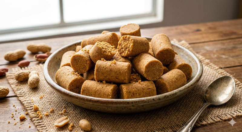 - Pegue o amendoim torrado, o açúcar, a farinha de milho e o sal, coloque-os em um triturador ou liquidificador. Processe até fiquem bem triturados e homogêneos. Pegue forminhas de sua preferência e coloque a mistura, socando com as mãos e modelando. Desenforme e está pronto para consumir.